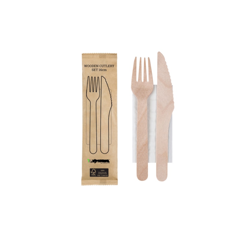 Dřevěný příborový set TESSERA 16 cm obsahující vidličku, nůž a ubrousek. Balení 5 × 100 ks (celkem 500 setů). Certifikace FSC 100%. Vhodné pro gastro provozy, catering a take-away.